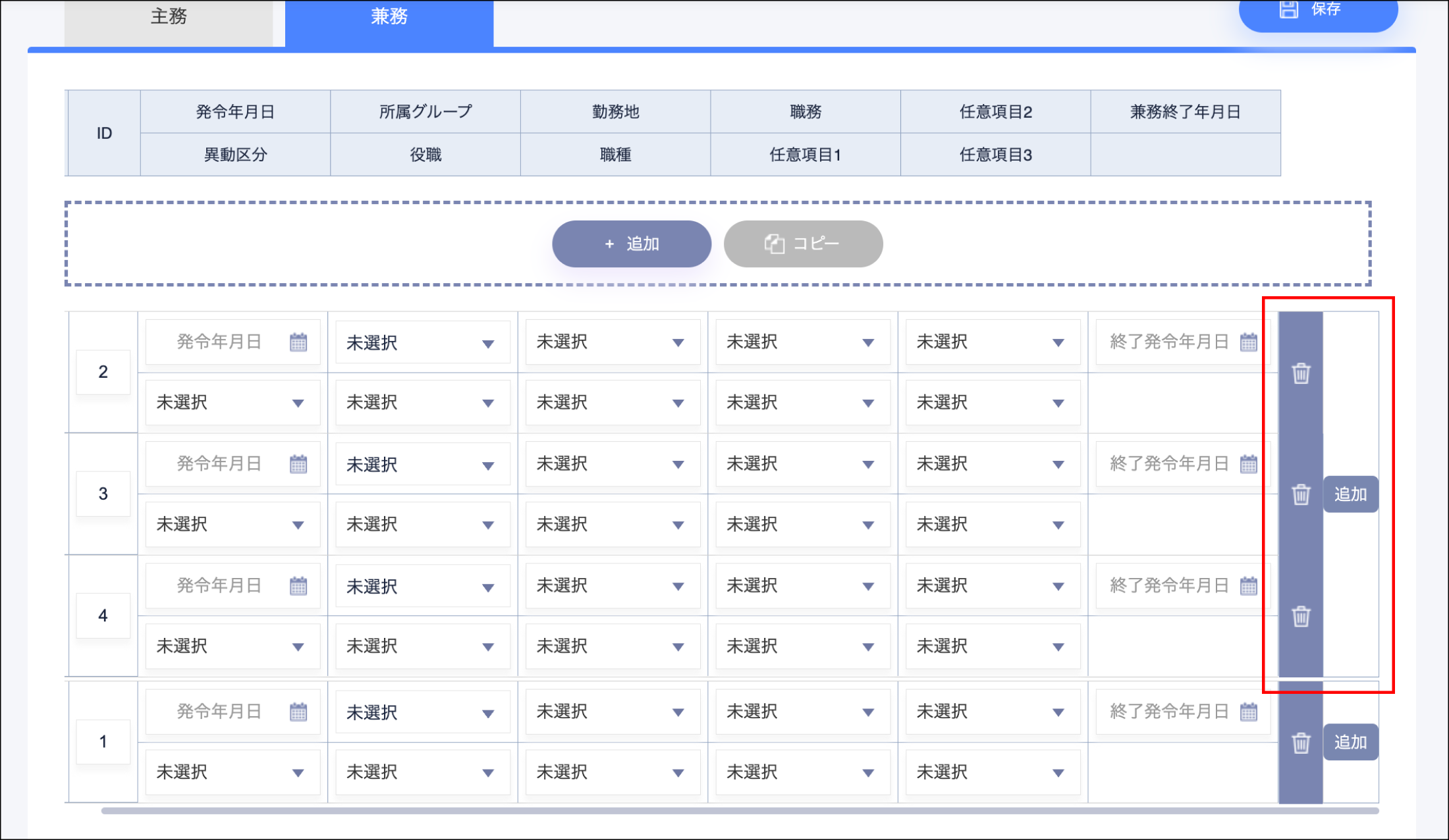 従業員管理>所属>兼務は、レコードの右に追加ボタンが表示されていました。