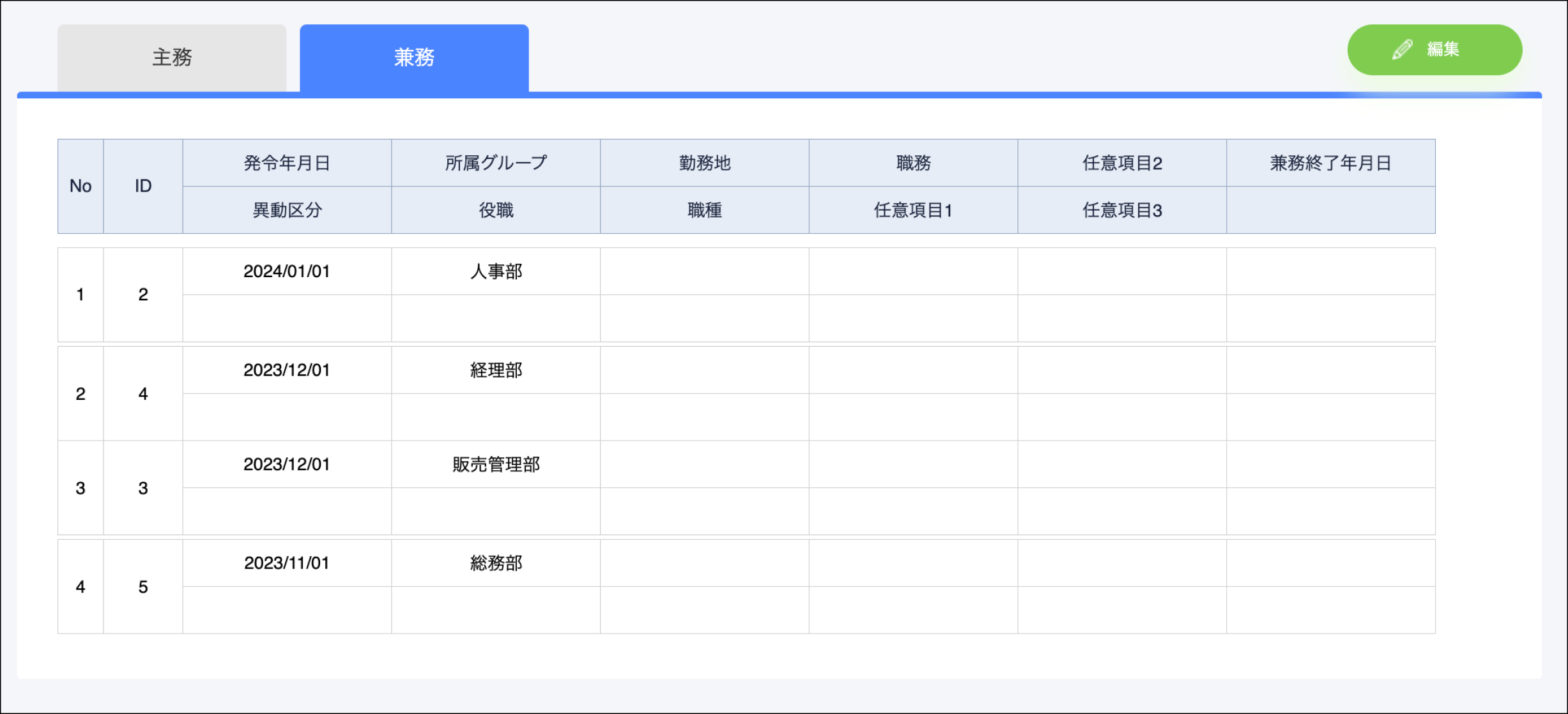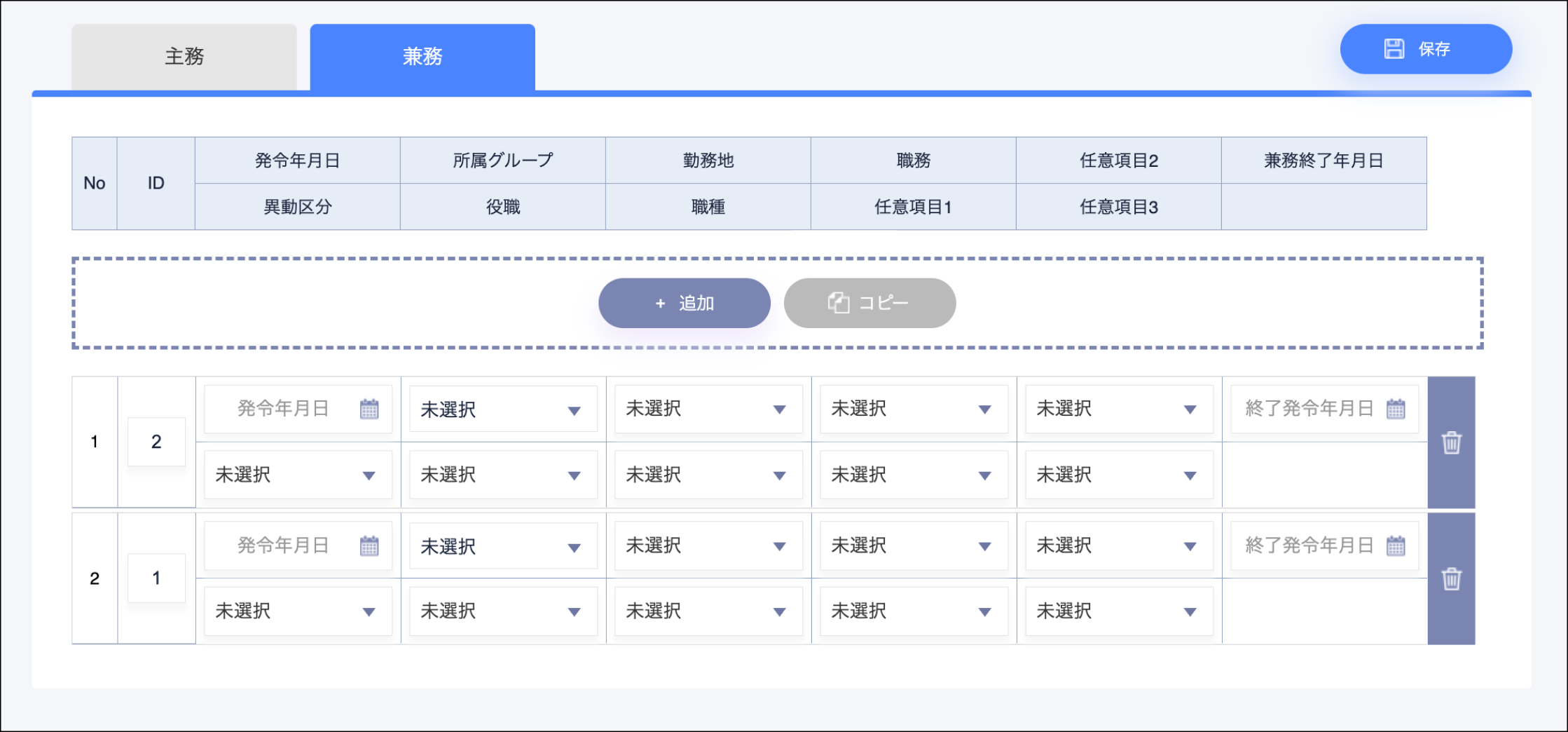 従業員管理>所属>兼務のレコード右の追加ボタンを削除し、グルーピングされない表示形式に変更しました。