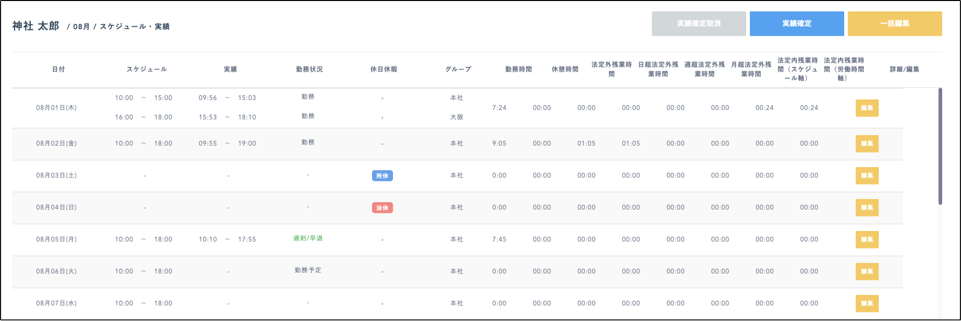 勤務情報画面/出勤簿データの日単位の集計値は打刻グループごとに表示されていました。