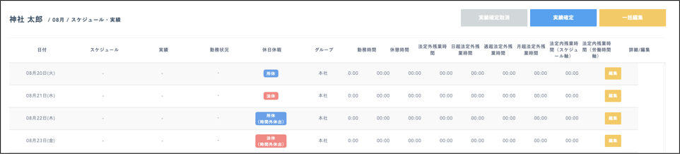 所定休日、所定休日(時間外休出)が登録されている日は背景色が青色で表示されず、休日のアイコンが表示されます。