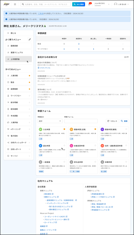 ジンジャーワークフローを契約している場合に、従業員画面から各申請書の作成画面に移動できる欄を設置しました。
