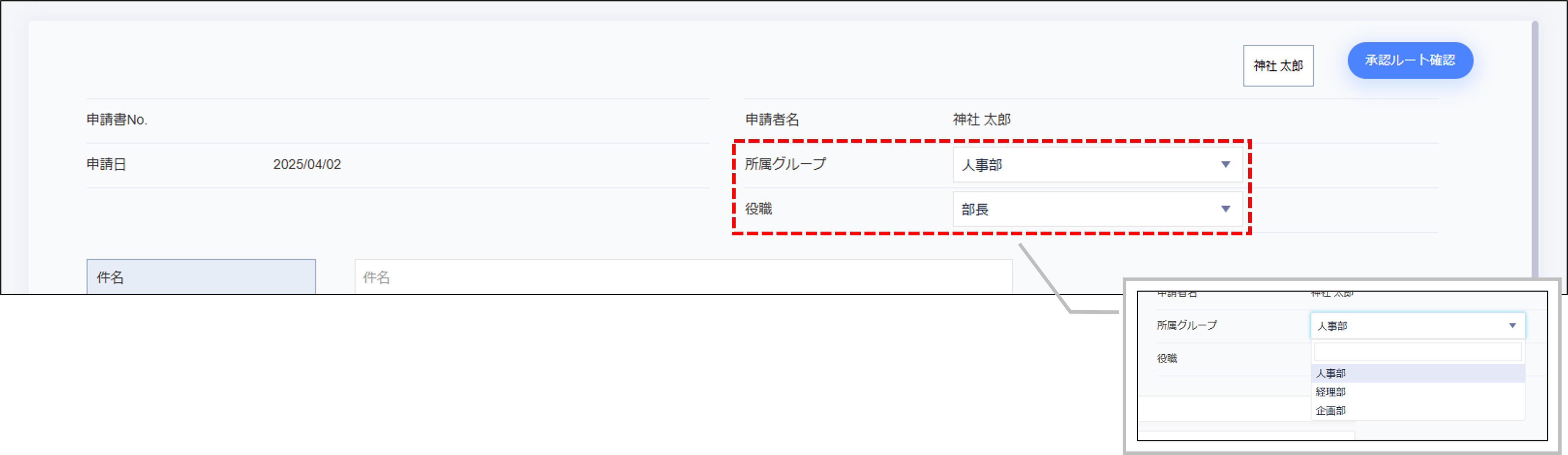 - 操作日時点の有効な所属グループ(主務/兼務)、それに基づく役職がプルダウンにそれぞれ表示され、選択できます。