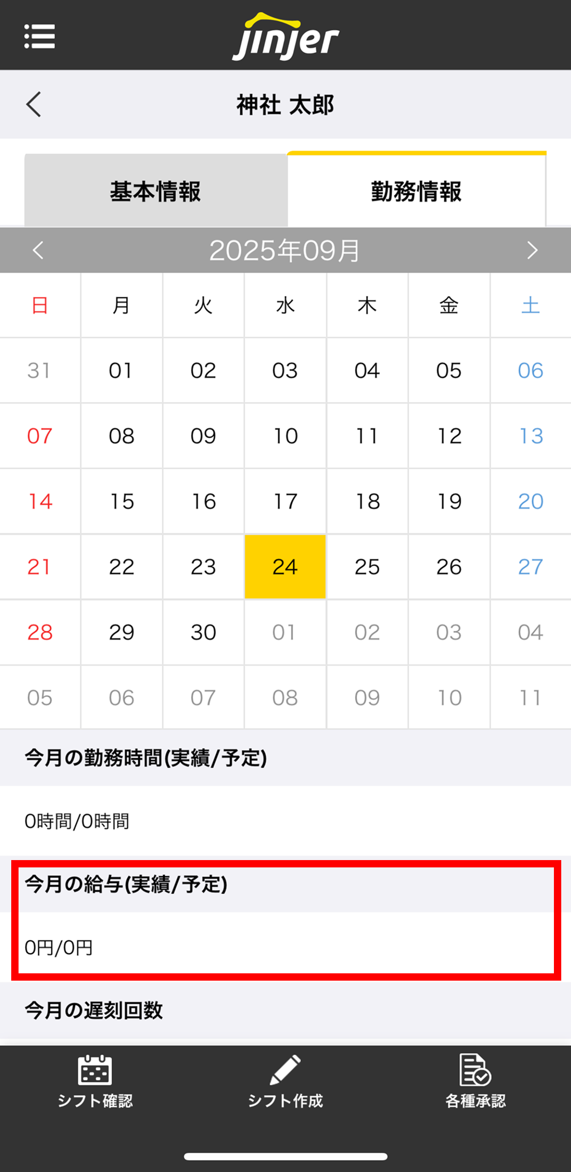 勤怠管理者アプリの勤務情報画面に項目「今月の給与(実績/予定)」が表示されます。